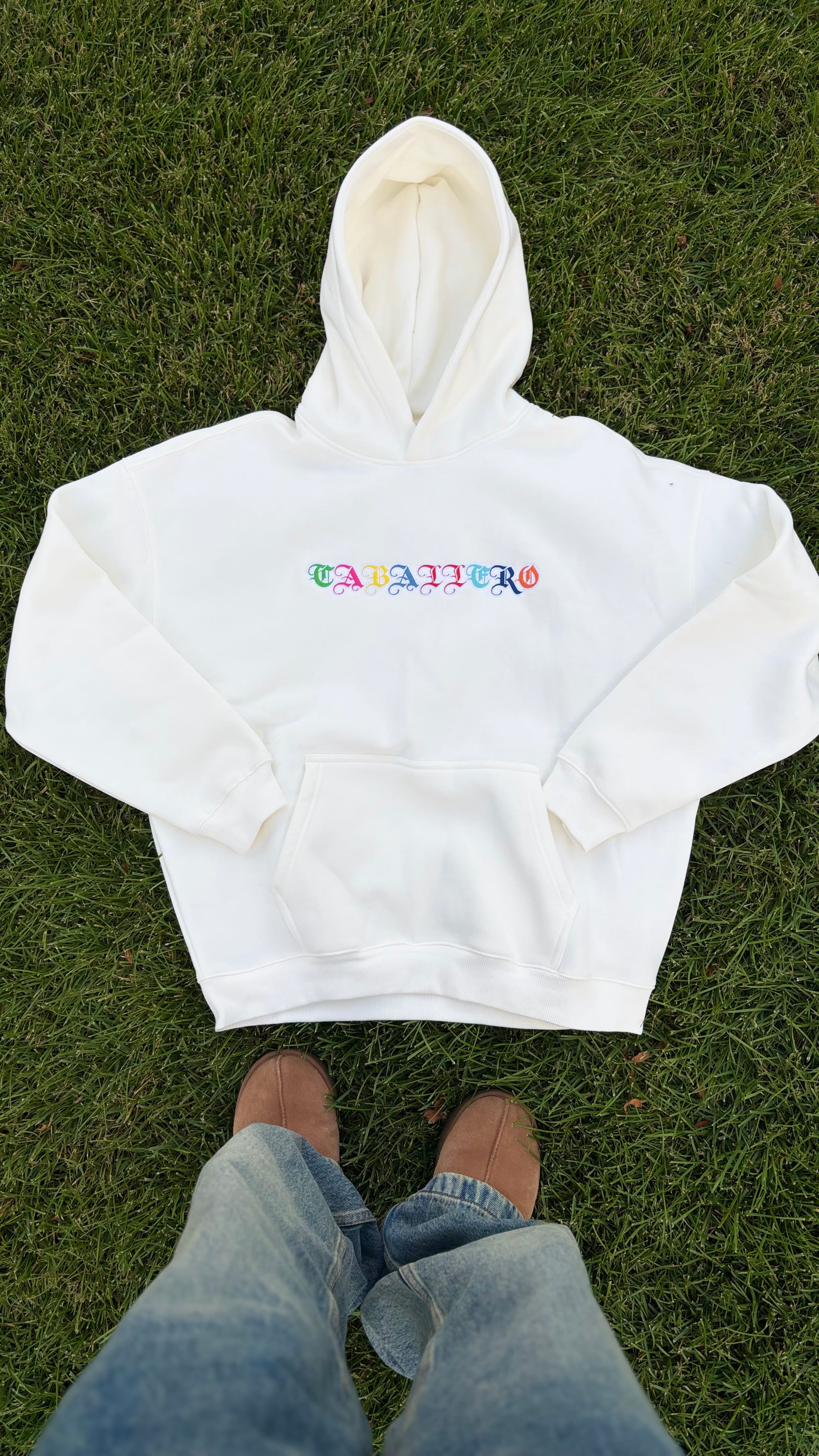 Stay warm and stylish in our Caballero Multicolor Logo Hoodie. Made with 360 grams of luxurious cream white fabric, it features a soft interior and clean design. True to size for a perfect fit, this hoodie is a must-have for the winter season.(WARNING)- This is a Pre-Order drop, meaning to expect long shipping times, and please contact us with any questions, or worries.